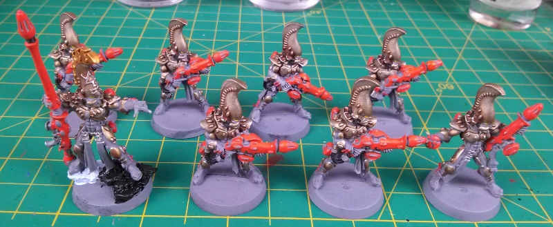 Super fun part. Blazing Orange is just as demanding as Sunburst Yellow and Surf Aqua. Shawn doesn't want traditional colours for his Aspect warriors. Figured I would go away from yellow and red.