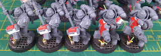 | Started Storm Bolter parts with Leadbletcher but felt that was too dull for Grey Knights. They are supposed to have the best gear in the Imperium. Then moved to Chainmail (on right). |