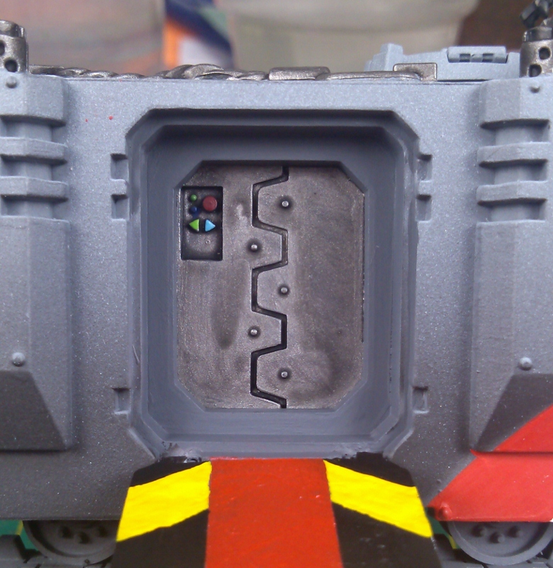 Skipping right past the markings.  Interior frame is Adeptus Battlegrey.  Door based Leadbelcher washed Army Painter Dark Tone.  Lights and buttons.  Goblin Green, Regal Blue, Scorpion Green, Ice Blue and Red Gore.